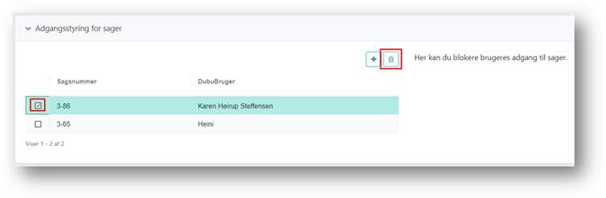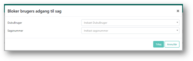 Systemet åbner en boks hvor du kan fremsøge en bruger og angive sagsnummeret på den sag brugeren ikke skal have adgang til.