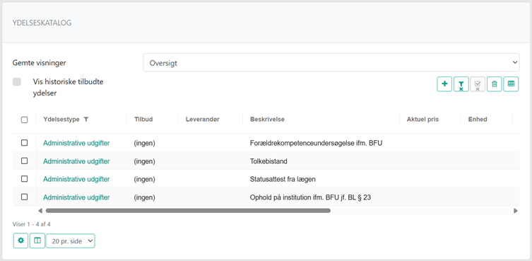 Hvis du skal oprette en administrativ udgift som fx forældrekompetenceundersøgelser, tolkebistand, udgifter til statusattest fra lægen, ophold på institution ifm. BFU § 23 mv., skal du anvende ydelsestypen ”Administrative udgifter”. Ydelsen har ingen tilbudstype eller lovhjemmel. Ydelsen har funktionsnummer 6.45.58. Superbrugere kan oprette ydelserne i ydelseskataloget og fx i beskrivelsesfeltet angive hvilken udgift, det handler om. Herunder finder du et eksempel på, hvordan det kunne se ud.