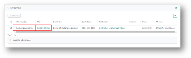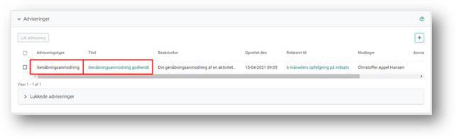 a. DUBU opretter adviseringen "Genåbningsanmodning" med titlen "Genåbn aktivitet" og ansvaret "Administrativ"
