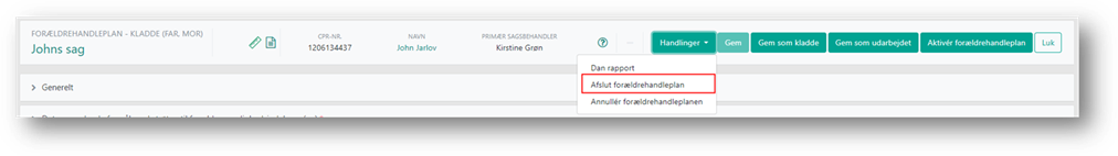 Når der ikke længere er behov for indsatser og du skal afslutte forældrehandleplanen, kan du via Handlinger afslutte forældrehandleplanen.