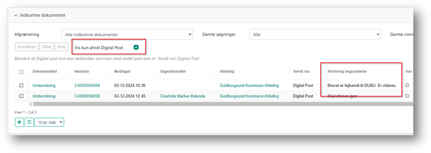 Denne begrundelse kan efterfølgende ses på oversigten over afviste dokumenter, ved at tilføje kolonnen ”Afvisning begrundelse”. Bemærk at denne kolonne alene gælder afviste dokumenter fra Digital post og ikke fx dokumenter modtaget fra andre systemer via Fordelingskomponenten.