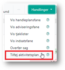 Du tilføjer en manuel aktivitetsplan på en sag ved at klikke på Handlinger på sagsmenuen og vælge Tilføj aktivitetsplan.