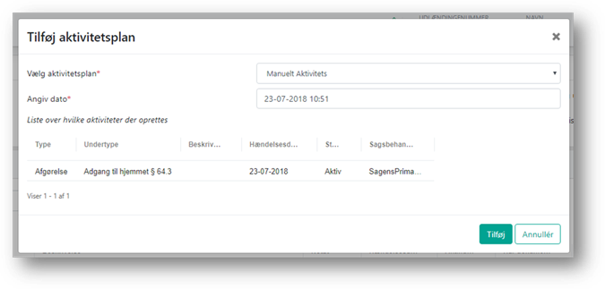 Herefter kommer en boks hvor du, gennem en rullemenu, kan vælge hvilken aktivitetsplan, der skal tilføjes og fra hvilken dato aktivitetsplanen skal være gældende på sagen. Datoen bruges til at beregne de øvrige aktiviteters hændelsesdato, når denne sættes eller ændres, vil det fremgå, hvilken hændelsesdato aktivitetsplanens aktiviteter vil få.