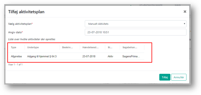 I boksen vises der hvilke aktiviteter, der bliver oprettet ved tilføjelse af aktivitetsplanen på sagen.