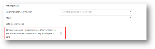 Hvis Ungdomskriminalitetsnævnet træffer afgørelse om, at en ung der allerede er anbragt efter barnets lov eller serviceloven, fortsat skal være anbragt jf. Lov om bekæmpelse af ungdomskriminalitet, skal anbringelsen ikke indberettes som en ny anbringelse. Der skal dog indberettes, at der er sket en ændring i lovgrundlaget for anbringelsen via aktiviteten ’Afgørelse – Ændret lovgrundlag for anbringelse’ og hvis barnet/den unge anbringes et andet sted, skal denne ændring også indberettes via aktiviteten ’Afgørelse – Ændret anbringelsessted’.