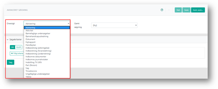 For at foretage en søgning skal du først vælge hvad du ønsker at søge efter, dette gøres via rullemenuen Oversigt.