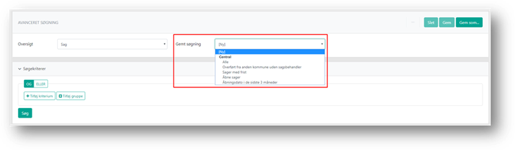 Hvis der på denne oversigt allerede findes gemte søgninger, kan du vælge at tage udgangspunkt i en af disse og foretage dine egne tilpasninger. Vælger du [Ny] opsættes søgningen fra bunden.