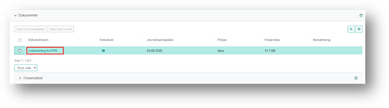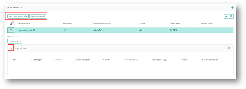 Du kan fra fanen Dokumenter sende et eller flere dokumenter, som forsendelse eller som e-mail. Du kan også se forsendelser foretaget på sagen, ved at folde fanen Forsendelse ud. Du kan læse om forsendelsesdetaljer i afsnittet Forsendelser.