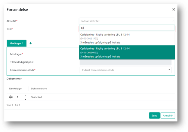 Hvis du vil sende dokumenter som forsendelse fra fanen Dokumenter, skal du indsætte den aktivitet, som forsendelsen skal tilknyttes. Det er muligt at fremsøge ikke-udførte aktiviteter på sagen.