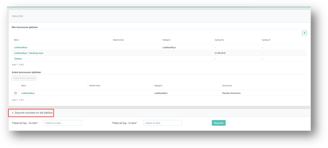 Uanset om du eksporterer resultater fra tjeklisteoversigten eller fra den enkelte tjekliste, skal du angive en periode i felterne Tilføjet på sag – fra-dato og Tilføjet på sag – til-dato. Og trykke på knappen Eksportér.