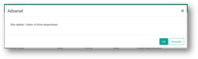 meddelelse om, at hele sagslisten vil blive eksporteret. Ønsker du at eksportere