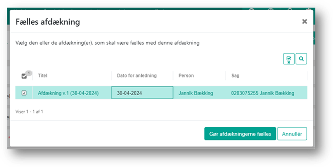 Når du opretter en fælles afdækning, skal du vælge hvilke(n) afdækninger, der skal gøres fælles med den aktuelle. Når du gør afdækninger fælles, træder dette i kraft på alle valgte søskendesager, det kan derfor gøres på hvilken som helst af søskendes afdækninger. Du kan tilføje en eller flere søskende til en fælles afdækning, ved at følge ovenstående vejledning igen.