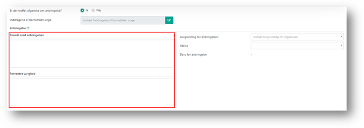 Du skal angive, om der er truffet afgørelse om anbringelse. Er der det, vil der være specialfelter, som du skal udfylde, inden du udfører aktiviteten. Nogle af oplysningerne i felterne indberettes automatisk til anbringelsesstatistikken, når du udfører aktiviteten og godkender den tilknyttede ydelse.