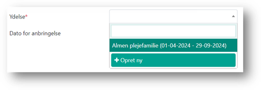 Hvis der er truffet afgørelse om anbringelse, skal du i feltet ’Ydelse’ indsætte anbringelsesydelsen. Du kan enten vælge mellem anbringelsesydelser, som allerede er oprettet på sagen eller du kan oprette en ny anbringelsesydelse ved at klikke på 'Opret ny’. DUBU indberetter først, når aktiviteten er gemt som udført og ydelsen er gemt som godkendt.