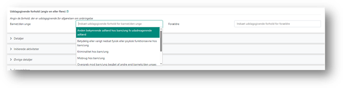 Under området ’Udslagsgivende forhold’ skal du angive hvilke forhold der er udslagsgivende for afgørelsen om anbringelse af barnet/den unge. Det gør du ved at klikke i feltet og vælge minimum et forhold for enten barnet/den unge eller forældre, men du har også mulighed for at angive flere forhold. For at indsætte flere forhold i ét felt, skal du klikke i feltet igen, og vælge de(n) relevante forhold.