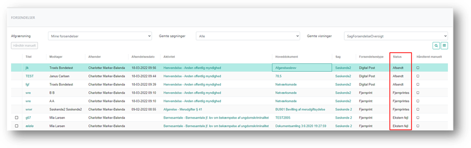 Hvis der i kolonnen står Ekstern fejl, er der tale om en fejl hos Digital Post eller Fjernprint. Du bør tjekke Servicemeddelelser for at se, om der har været ustabilitet og evt. forsøge genfremsendelse af forsendelsen. For at genfremsende forsendelsen skal du foretage en ny forsendelse. Hvis aktiviteten har været udført, skal du sende en genåbningsanmodning på aktiviteten for at kunne foretage ny forsendelse.