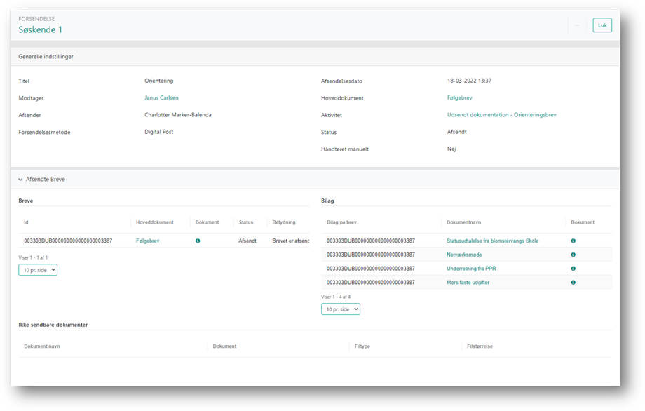 På detaljesiden for forsendelse kan du se, hvis en forsendelse er blevet opdelt i flere breve. Det kan ske hvis dokumenterne der indgår i forsendelsen, overstiger størrelsesbegrænsningen for Digital post og Fjernprint. Du kan læse mere om størrelsesbegrænsninger for Digital post og Fjernprint i afsnittet Store forsendelser. Hvis en forsendelse er opdelt, betyder det, at der er afsendt flere breve. Du vil kunne se disse breve under fanen Afsendte Breve.