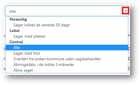 Du kan skifte mellem gemte søgninger på en række oversigter i systemet. Brugervejledningen vil tage udgangspunkt i oversigten ”Sager”, men vil også være gældende for de resterende oversigter.
