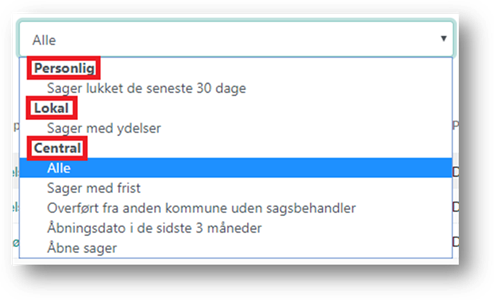 De søgninger der ligger under ”Centrale”, er oprettet centralt og kan ses på tværs af alle kommuner.