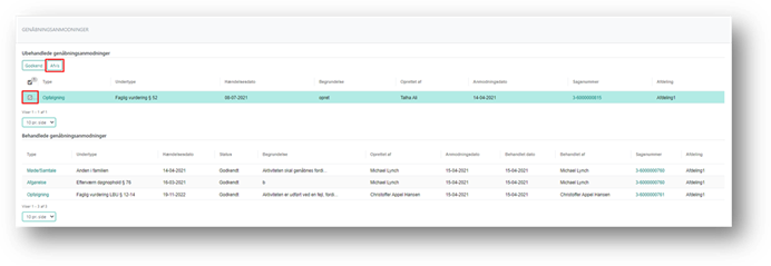 Af listen over behandlede genåbningsanmodninger kan du til en hver tid se, om en genåbningsanmodning er godkendt eller afvist, samt hvem der har behandlet den.