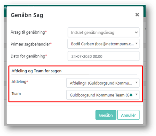 Herefter skal du angive årsagen til, at sagen skal genåbnes, hvem der skal være primær sagsbehandler på sagen samt datoen for genåbningen. Derudover skal du vælge hvilken afdeling og eventuelt team, sagen skal ligge i. Hvis den valgte primære sagsbehandler kun er tilknyttet én afdeling og/eller team, vil felterne for sagens Afdeling og Team være automatisk udfyldt med denne afdeling eller dette team