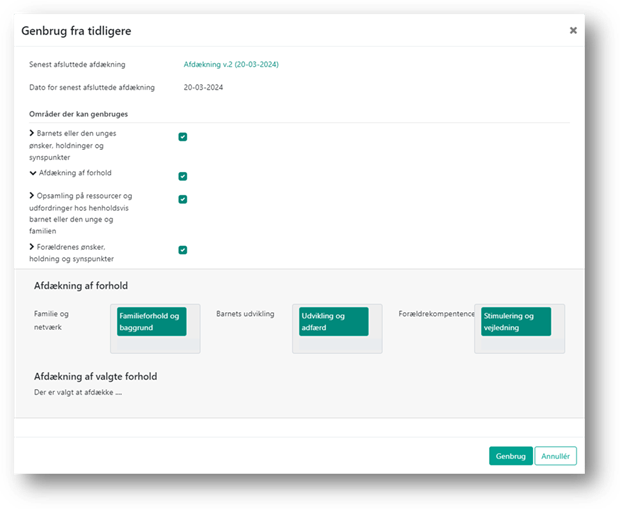 Klikker du på knappen ”Genbrug”, kan du vælge, hvilket indhold du ønsker at genbruge. Du kan kun genbruge oplysninger fra den seneste afdækning. Hvert område kan du udvide for at se indholdet, samt til- og fravælge hvilke områder der skal genbruges.