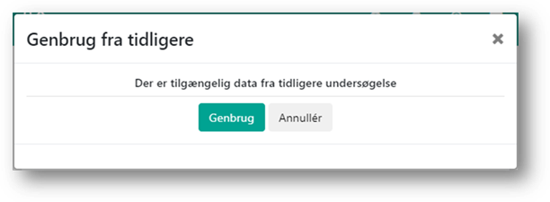 Klikker du på ’Annullér’, eller X i højre hjørne, åbnes den ungefaglige undersøgelse, hvor du kan påbegynde udfyldelse af undersøgelsen uden at genbruge indhold fra tidligere undersøgelse. Du kan ikke fortryde dit valg og senere vælge at genbruge.