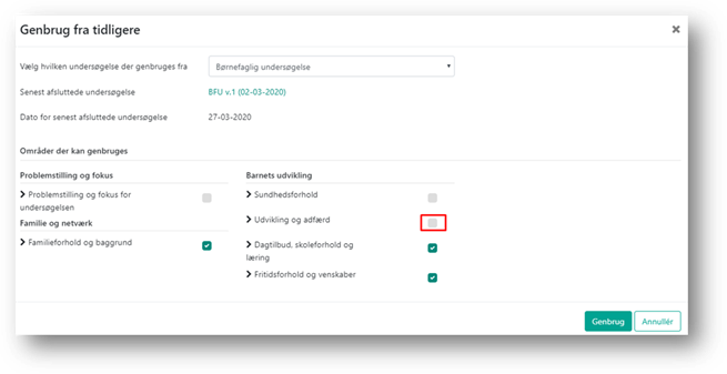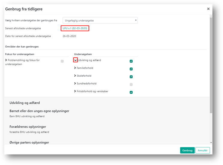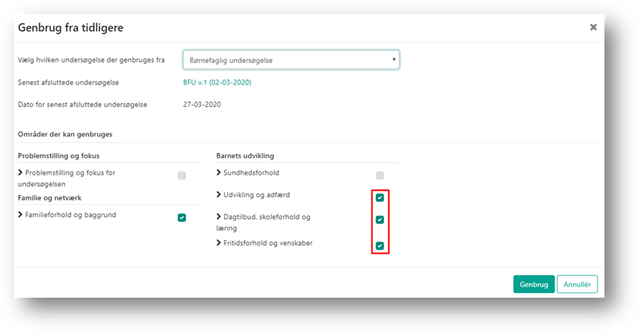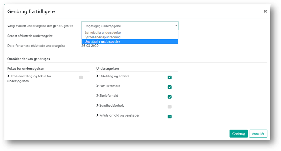 Klikker du på knappen ’Genbrug’, kan du vælge, hvilket indhold du ønsker at genbruge. Du kan kun genbruge oplysninger fra den seneste undersøgelse, dette kan både være en børnefaglig undersøgelse, en ungefaglig undersøgelse eller en børnehandicapudredning. Såfremt der både ligger en tidligere børnefaglig undersøgelse, ungefaglig undersøgelse og børnehandicapudredning, kan der vælges, hvilken der ønskes at genbruge oplysninger fra.
