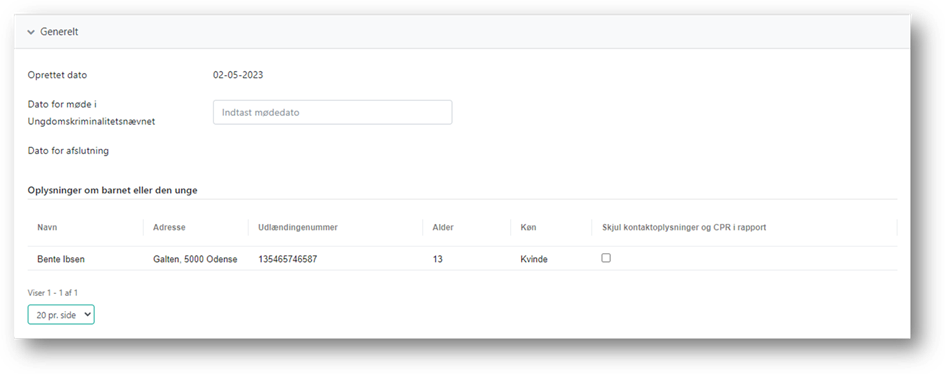 På fanen Generelt vises oplysninger om, hvornår indstillingen er oprettet og afsluttet, samt oplysninger om barnet/den unge.