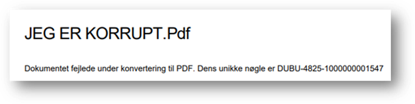Ved mange store filer kan generering af dokumentsamlingen i nogle tilfælde tage længere tid end normalt. DUBU bør automatisk springe over filer, der ikke kan genereres til PDF, fx krypterede mails eller korrupte filer, disse filer vil fremgå i rapporten, som et fejlet dokument.