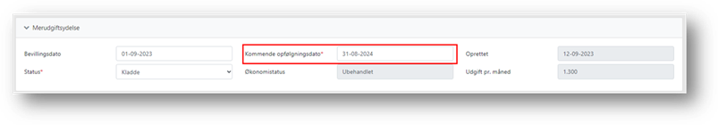 Inden du godkender din merudgiftsydelse, skal du indsætte ’Kommende opfølgningsdato’ for merudgiftsydelsen.
