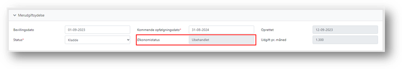 ’Økonomistatus’. Når ydelsen er blevet behandlet af en økonomimedarbejder, vil økonomistatus skifte til ’Behandlet’. Du kan læse mere om økonomibehandling i afsnittet Økonomibehandling.