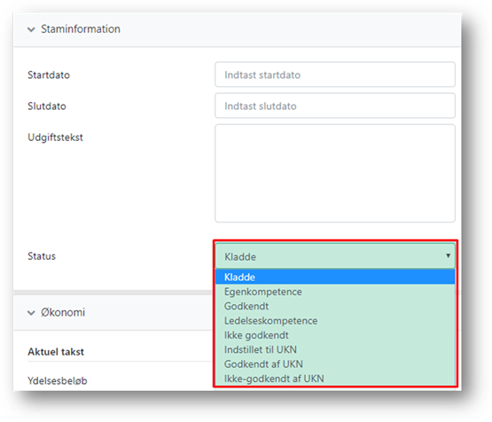 Du godkender en ydelse ved at klikke på feltet ’Status’ under fanen ’Staminformation’ på ydelsen og vælge enten ’Godkendt’, ’Egenkompetence’, ’Ledelseskompetence’ eller ’Godkendt af UKN’.
