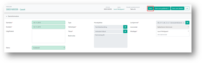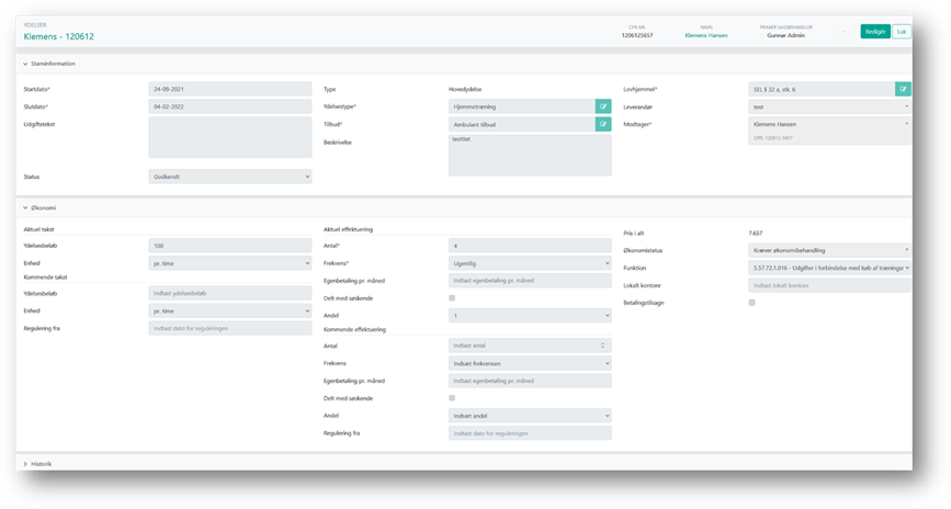 Når ydelsen er godkendt, låses alle felter for redigering. Du kan læse om, hvordan godkendte ydelser kan redigeres i afsnittet Redigering af godkendt ydelse.
