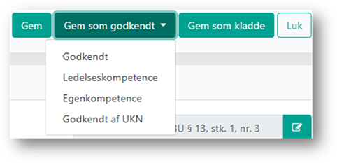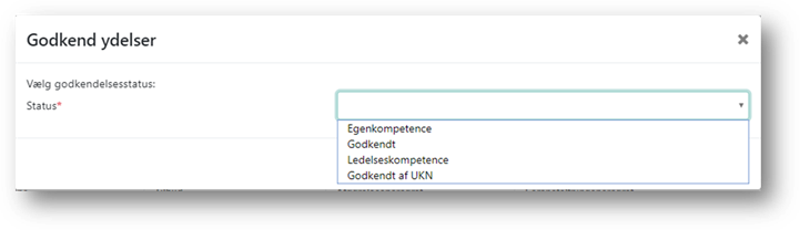 Du kan også gemme ydelsen som godkendt direkte gennem knappen ’Gem som godkendt’, hvor du kan vælge mellem status ’Godkendt’, ’Ledelseskompetence’, ’Egenkompetence’ eller ’Godkendt af UKN’.