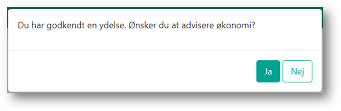 Når du godkender ydelsen gennem knappen ’Gem som godkendt’, eller ved at sætte statusfeltet til en ’Godkendt’ - status og ’Gem’, åbnes en boks, hvor du bliver bedt om at tage stilling til, om du ønsker at advisere en økonomimedarbejder om ydelsen.