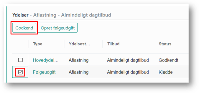 Hvis du skal godkende flere ydelser på én gang, kan det være en fordel at gøre det fra listen over ydelser. Du gør det ved at markere de ydelser, som skal godkendes. Når du har valgt en eller flere, kan du klikke på knappen ’Godkend’.