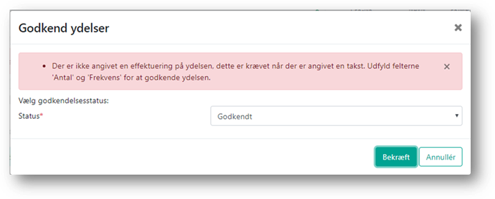 Når du har klikket på ’Godkend’, skal du vælge, hvilken status ydelserne skal ændres til og klikke på ’Bekræft’.