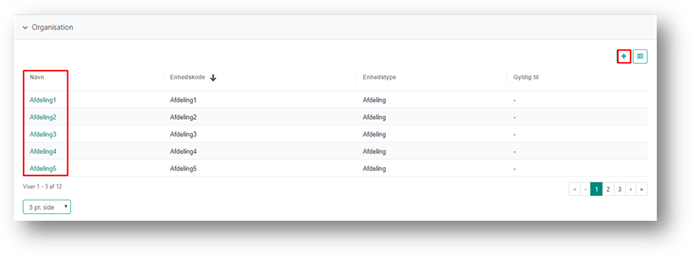 I fanen Organisation kan du se og redigerer eksisterende afdelinger og teams ved at klikke på Navn. Du kan læse mere om redigering af din kommunes organisation i afsnittet Rediger organisatoriske enheder.