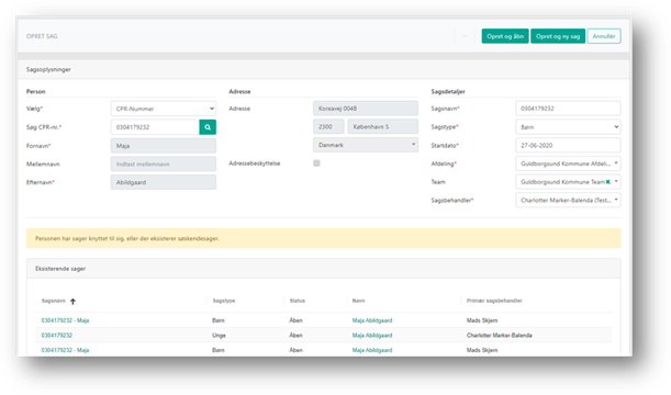Hvis personen allerede har en sag eller indgår i barnets netværk på en sag i samme kommune, vises en meddelelse om, at der findes én eller flere andre sager på personen og/eller at personen indgår i barnets netværk på eksisterende sager. Derved bliver du gjort opmærksom på evt. ikke at oprette en ny sag.