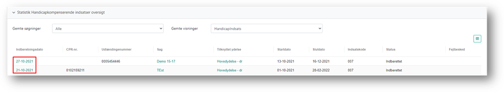 Du åbner indberetningen for en handicapkompenserende indsats ved at klikke på linket i kolonnen Indberetningsdato.