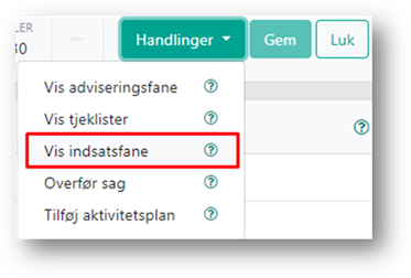 Fanen ’Indsats’ er som standard skjult, hvis der ikke findes indsatser på sagen. Du tilføjer fanen på sagen ved at klikke på ’Handlinger’, ’Vis indsatsfane’.