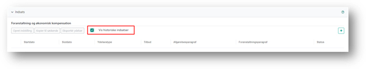 Du kan se støttende indsatser, anbringelser og/eller handicapkompenserende indsatser under fanen ’Indsats’. Det er også herfra du opretter nye indsatser og ydelser. Når du registrer indsatserne på sagen, giver det et fagligt og økonomisk overblik over, hvad der er bevilliget på sagen. Derudover vil oplysninger fra de ydelser, du opretter under fanen ’Indsats’, blive anvendt til indberetninger til Danmarks Statistik. Du kan læse om indberetninger i afsnittet Indberetninger til Danmarks Statistik.