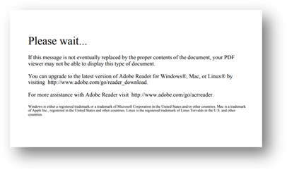 Ovenstående fejlmeddelelse opstår fx, hvis PDF filen indeholder elementer, der kun kan vises, når filen åbnes i Adobe Acrobat Reader. I kan omgå dette ved at kopiere det direkte link til dokumentet på dens detaljeside, og åbne dette i Adobe Acrobat Reader, eller ændre standardindstilling for, hvilket program jeres browser som standard åbner PDF dokumenter i.