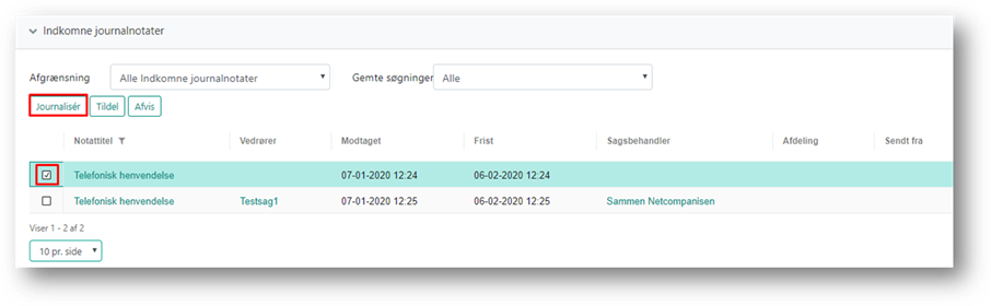 Fra oversigten over indkomne journalnotater, vælger du det journalnotat som du vil journalisere, dernæst klikker du på knappen ”Journaliser” for at journalisere notatet.