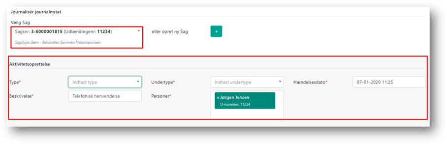 Efter du har valgt en sag, vil du nu skulle oprette en ny aktivitet, hvor journalnotatet kan blive journaliseret på. Du skal selv udfylde Type og Undertype og lave eventuelle rettelser af de øvrige felter. Beskrivelse vil automatisk være udfyldt med Notattitel, Hændelsesdato vil være udfyldt med Modtaget dato og Person vil være udfyldt med primær person på sagen.