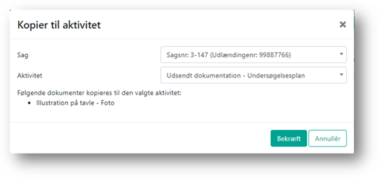 Vælg den sag og aktivitet, som du ønsker dokumentet kopieret til. Det vil nu fremgå af boksen, hvilke(t) dokument der kopieres til den valgte sag og aktivitet. Herefter bekræftes det valgte og DUBU opretter kopi af dokumentet.