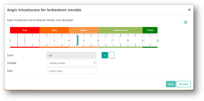 Du klikker på Gem for at registrere trivselsscoren. Klikker du i stedet på Annullér knappen lukkes boksen uden trivselsscoren afgives.