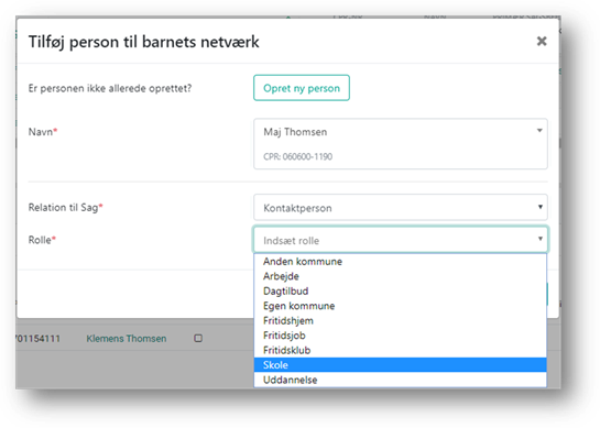 Bemærk roller for nogle organisationer, findes under ’Kontaktperson’ fx skole, dagtilbud mv. Under Professionel kontakt findes personrelaterede roller som fx lærer, pædagog. Hvis I mangler mulige roller og relationer, skal der rettes henvendelse til KOMBIT.