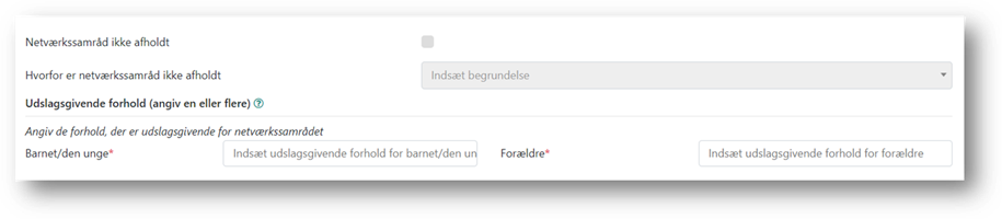Når der på en sag, skal afholdes et netværkssamråd, skal du anvende aktiviteten Møde/samtale – Netværkssamråd, BL § 130. På aktiviteten skal du angive hvilke forhold, der er udslagsgivende for, at netværkssamrådet skal afholdes. Er der mere end et forhold, som danner baggrund for netværkssamrådet, er det vigtigt at du angiver dem alle, da oplysningerne indberettes til DST.
